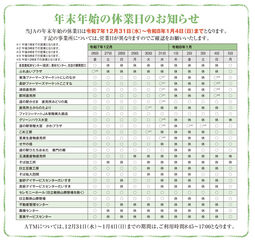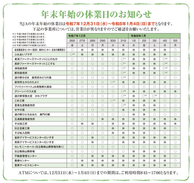 JA常陸の年末年始の休業日を別途ファイルの通りご案内いたします。
